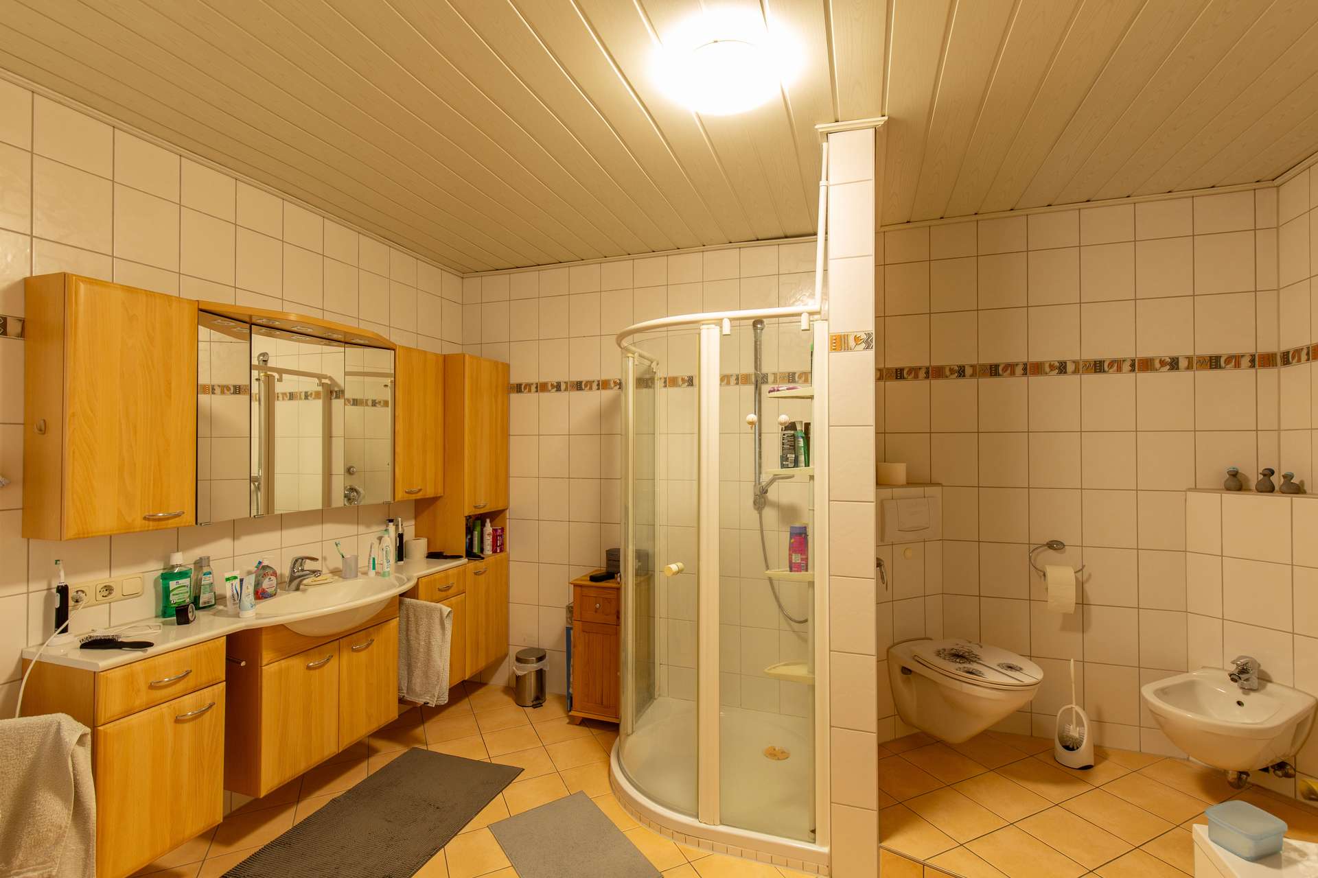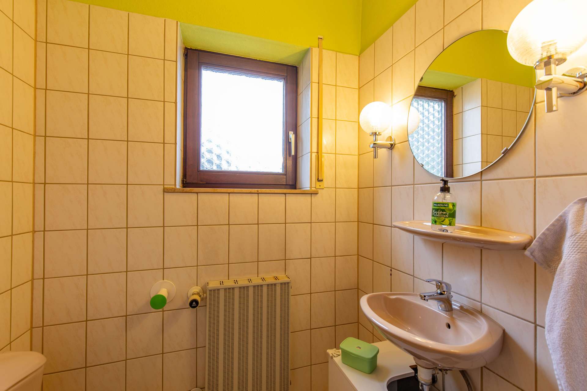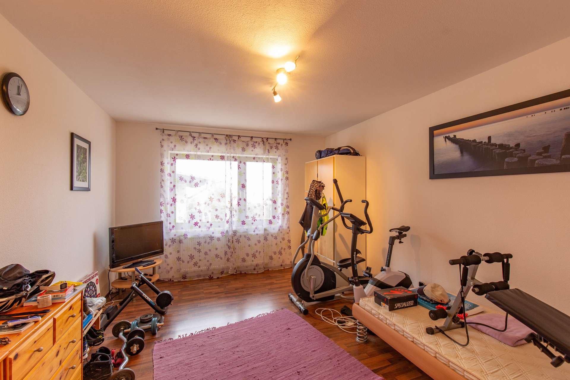 Das Erdgeschoss beherbergt die privaten Rückzugsräume. Ein großes Schlafzimmer, ein Kinderzimmer sowie ein gut geschnittenes Badezimmer bilden den Schlafbereich. Darüber hinaus stehen funktionale Räume wie Waschkeller, Vorratsraum und Heizraum zur Verfügung. Vom Erdgeschoss aus besteht Zugang zu einer weiteren Terrasse, die sich ideal als ruhiger Gartenplatz anbietet.