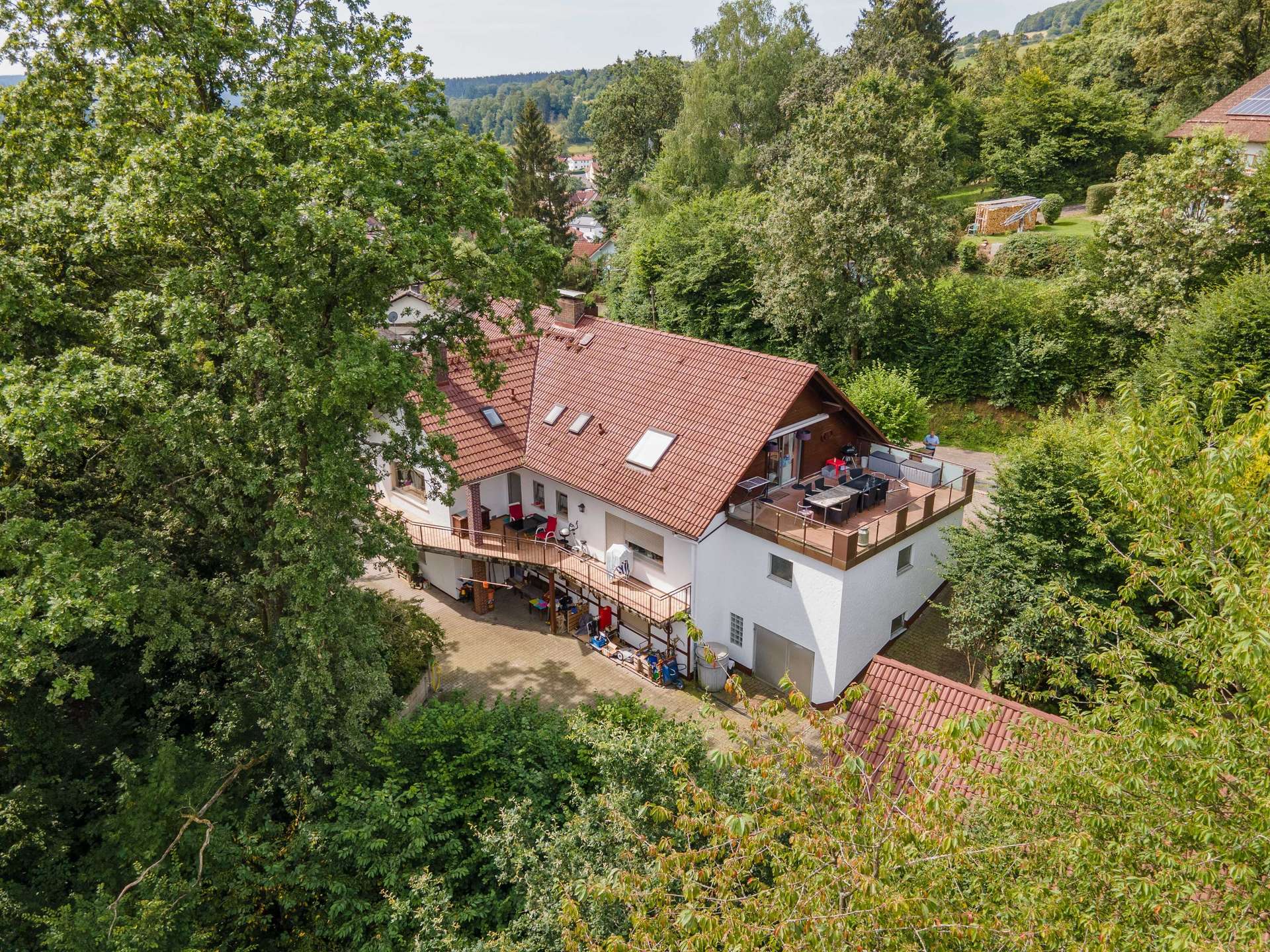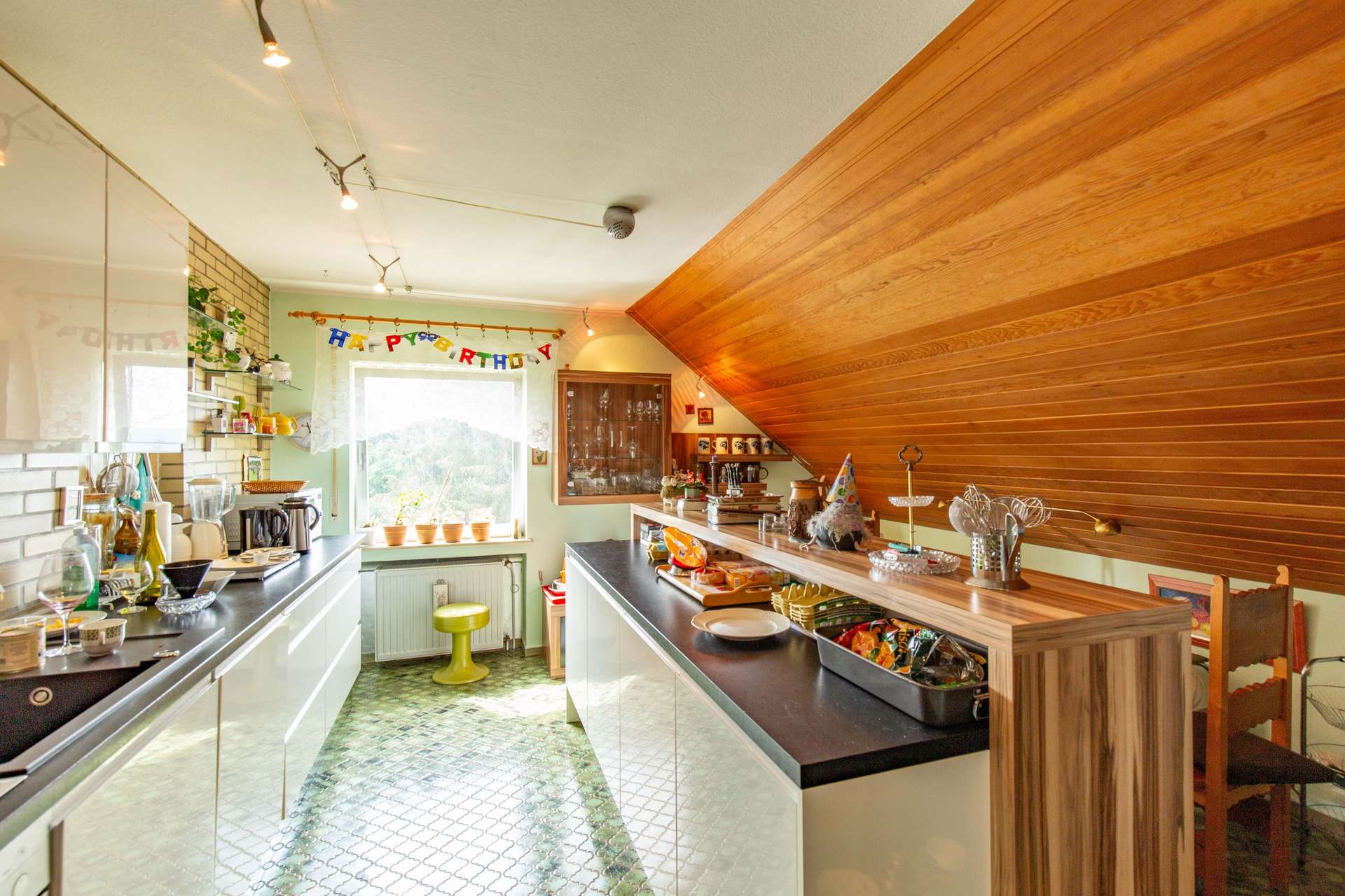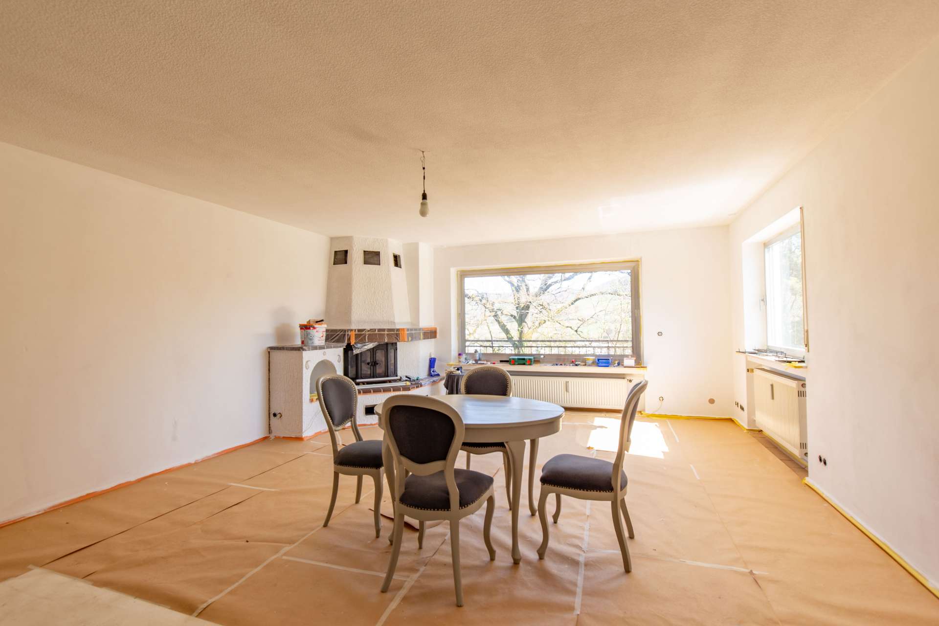 Wohnzimmer, Schlafzimmer, Küche, Abstellraum, Besenkammer, Bad, separates WC und eine großzügige Terrasse mit traumhaftem Blick über das Sinntal – ein echtes Highlight des Hauses.