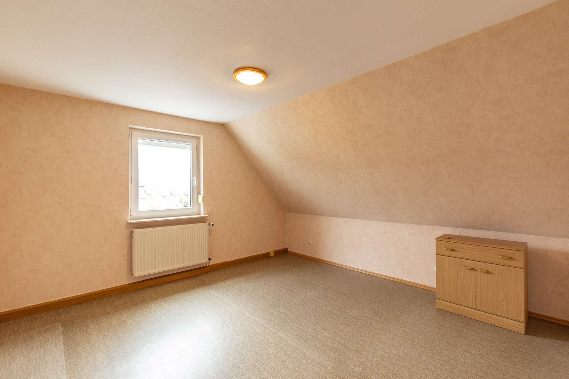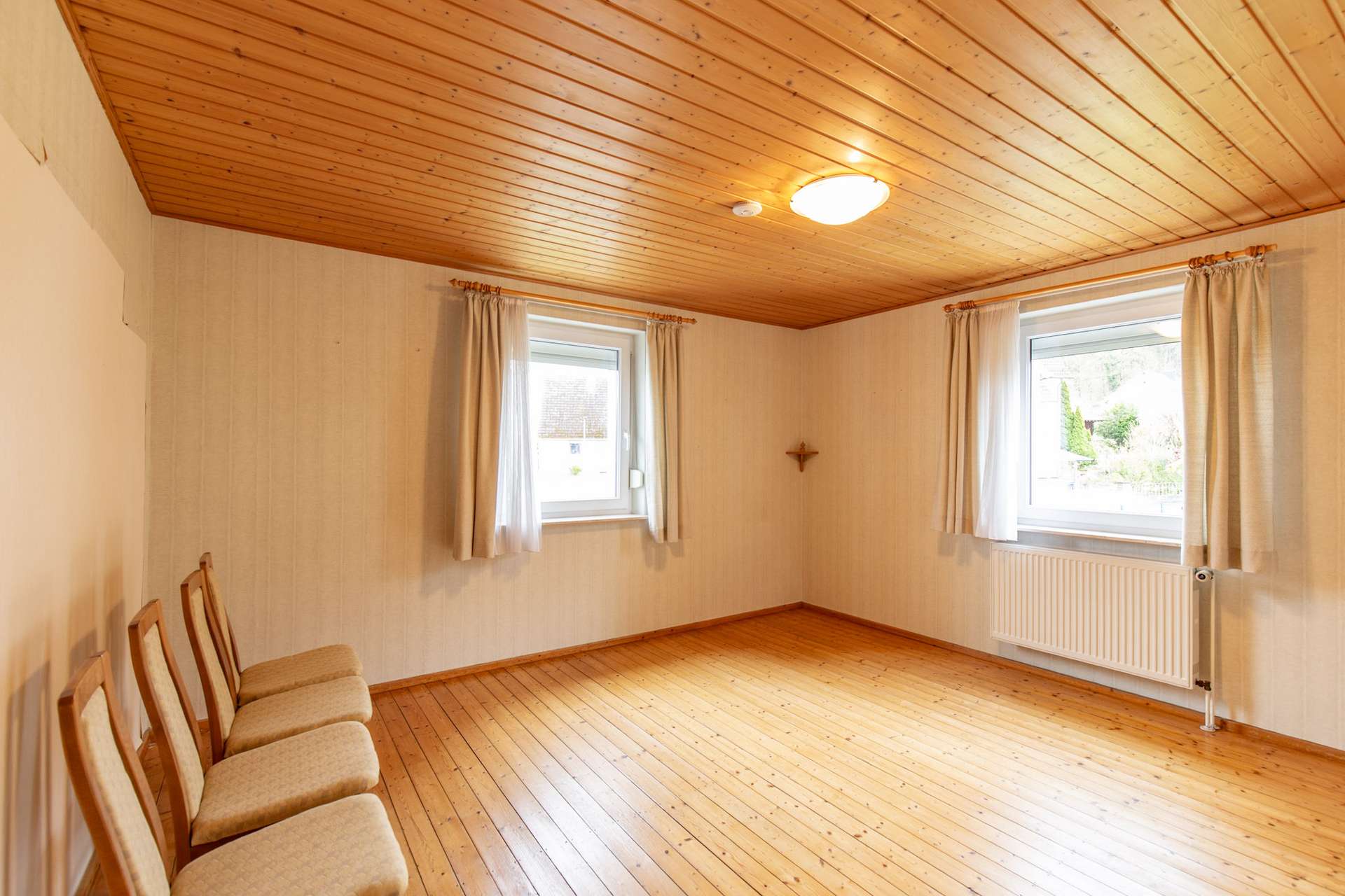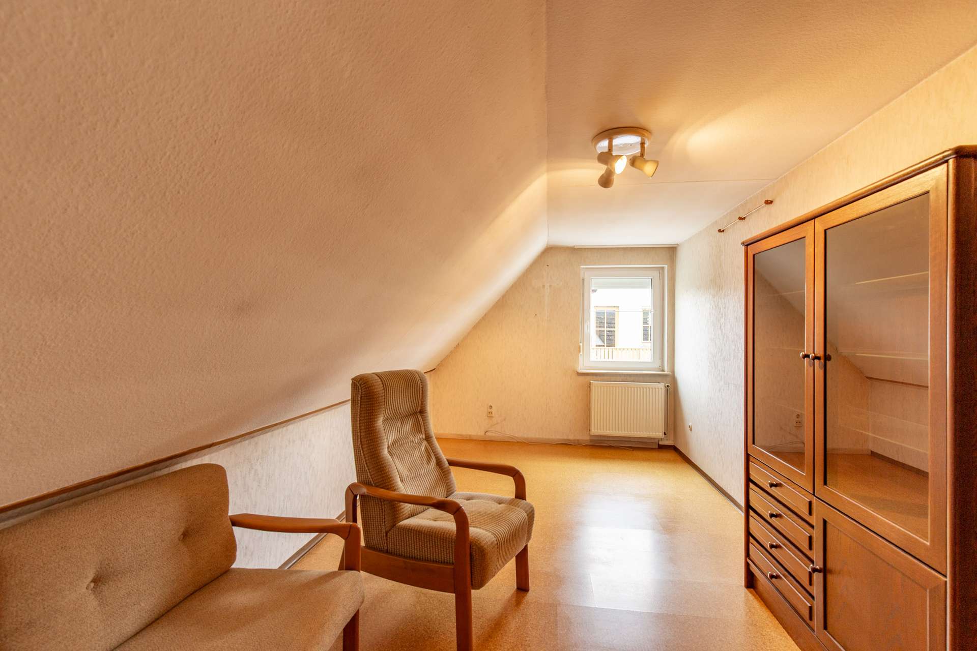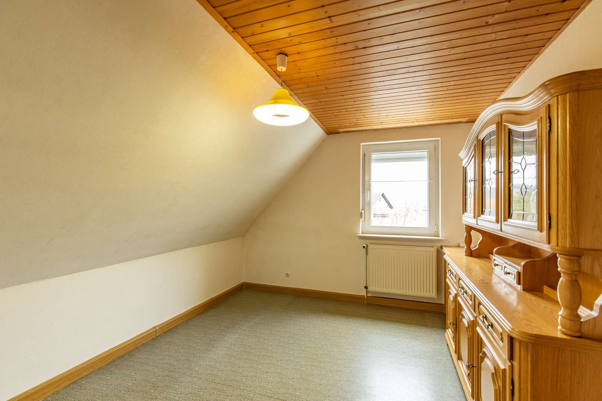 Im Obergeschoss befinden sich weitere Räume mit ca. 55 m² Wohnfläche. Die Dachschrägen verleihen den Zimmern einen gemütlichen Charakter und schaffen zusätzliche Rückzugsorte für die Familie.