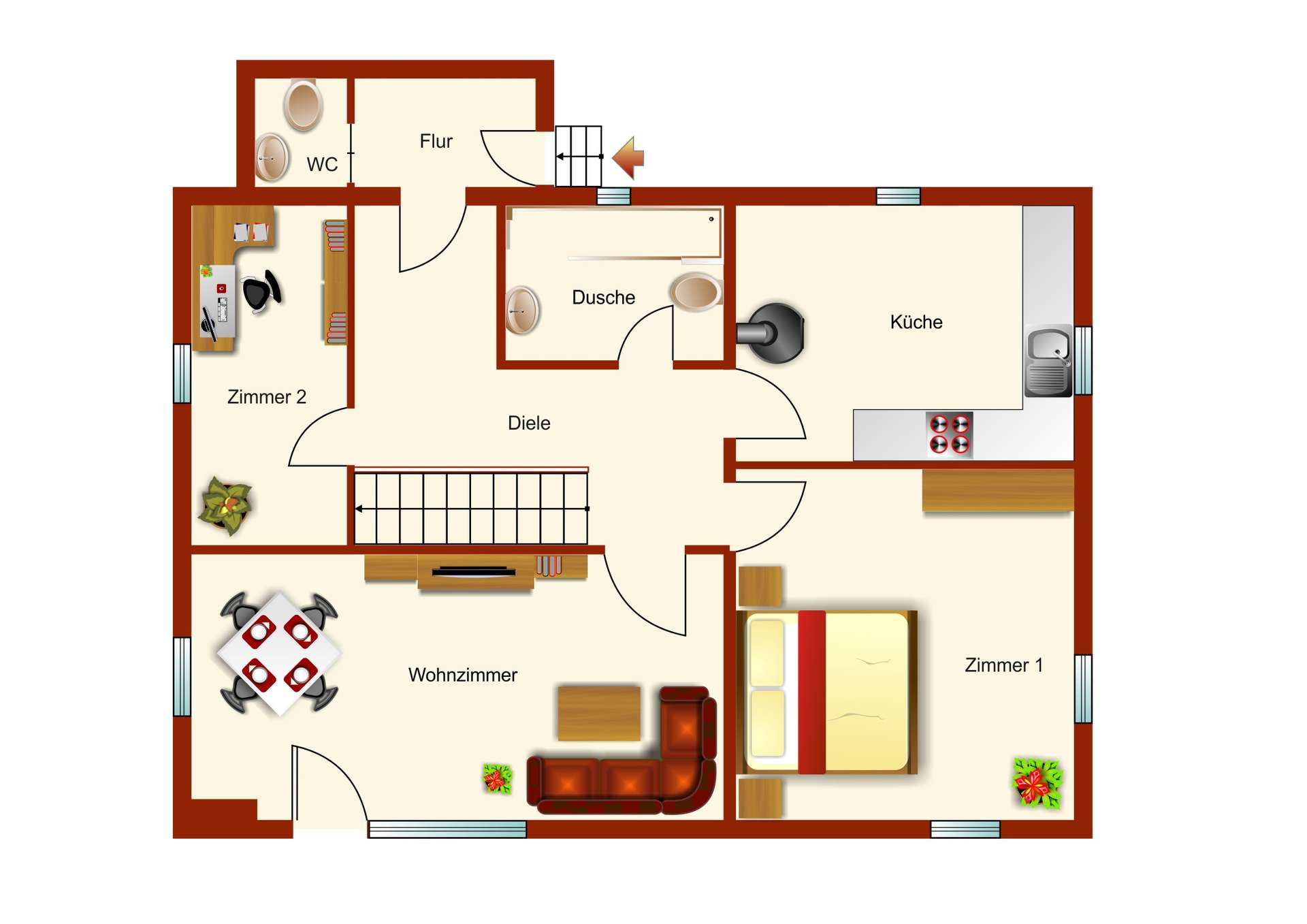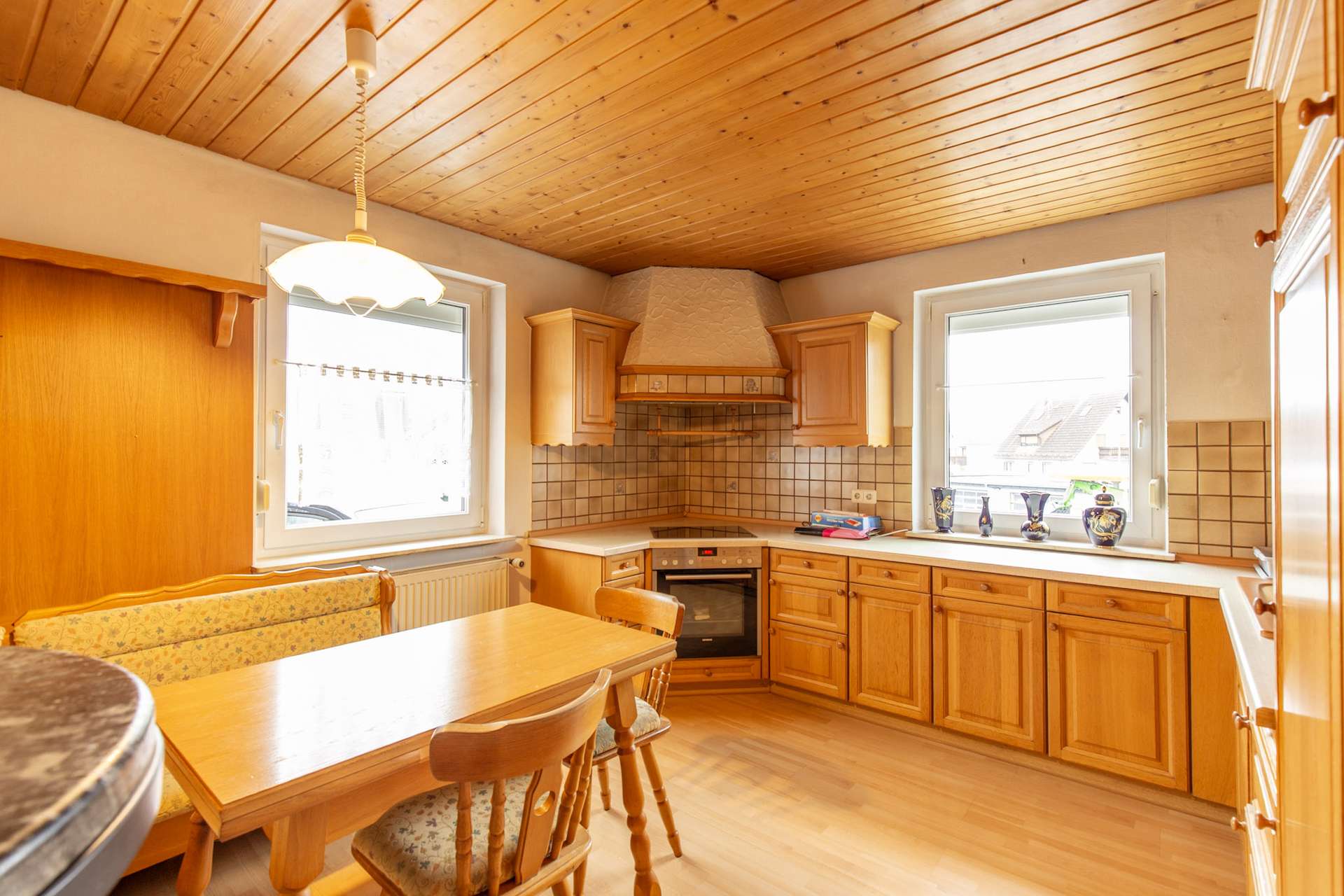 Die Küche ist funktional gestaltet und bietet ausreichend Platz für den täglichen Gebrauch. Zusätzlich steht im Erdgeschoss ein Gäste-WC zur Verfügung.